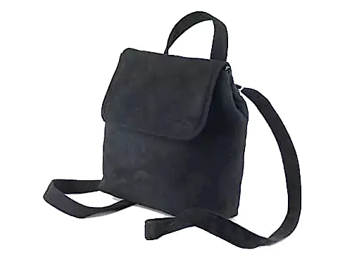 Super-trendy little backpack in faux suede Size – Small (25cm x 22cm x 6cm) Closure – magnetic snap. Short carry handle Outside back zip pocket, also inside zip pocket